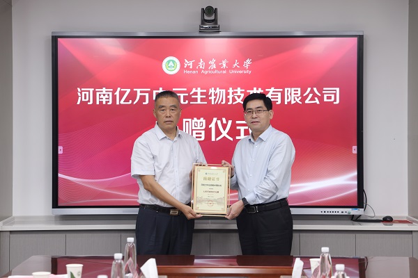 郑文革介绍了河南亿万中元生物技术有限公司的发展历程、经营范围、经营理念。他表示,个人和公司的成长离不开母校辛勤培养,他一直关注和关心母校发展,为母校近年取得的成绩深感自豪。他希望,通过此次捐赠,能够与母校展开更广泛的校企合作,加速产学研进程,将科研成果转化为生产力,达到行业先进水平。