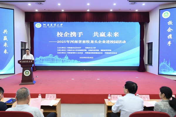 本网讯(通讯员 林智雅)5月26日,以“校企携手 共赢未来”为主题的2025年河南省畜牧龙头企业进校园活动在我校隆重举行。河南省农业农村厅总畜牧师张全勇、畜牧处处长王彦华、饲料兽药处处长胡赓,河南省动物保健品协会会长郑宝振、河南省饲料工业协会会长郑文革、河南省奶业协会秘书长陈华杰,我校副校长郭战伟、招生就业办公室副主任曾玲玲、动物医学院院长魏战勇、巨乳a片