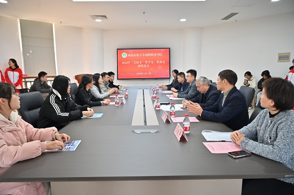 于龙子湖校区第一实验楼南501会议室举行2024年“艾格多”企业奖学金、奖教金颁奖仪式。河南艾格多科技集团有限公司总裁任振东与人资行政总监孙爱平、校友办主任胡明忠、巨乳a片