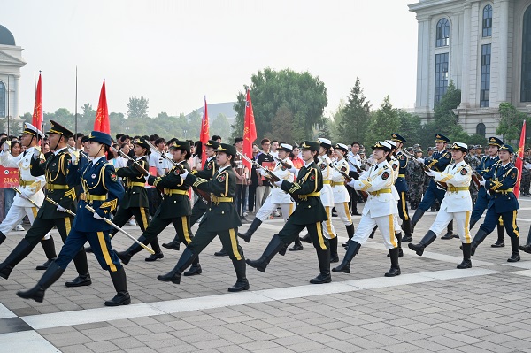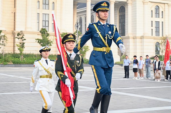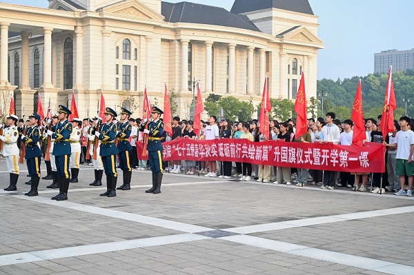 于龙子湖校区举行“七十五载春华秋实 砥砺前行共绘新篇”秋季新学期升国旗仪式,学院全体师生参与活动,仪式由院党委副书记郭娟主持。