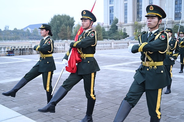 在全体师生的注视下,国旗护卫队迈着整齐豪迈的步伐将国旗护送至升旗台,伴随着气势磅礴的《义勇军进行曲》,五星红旗冉冉升起。在场师生神情肃穆,向国旗行注目礼,满怀对祖国的无限热爱与崇高敬意。