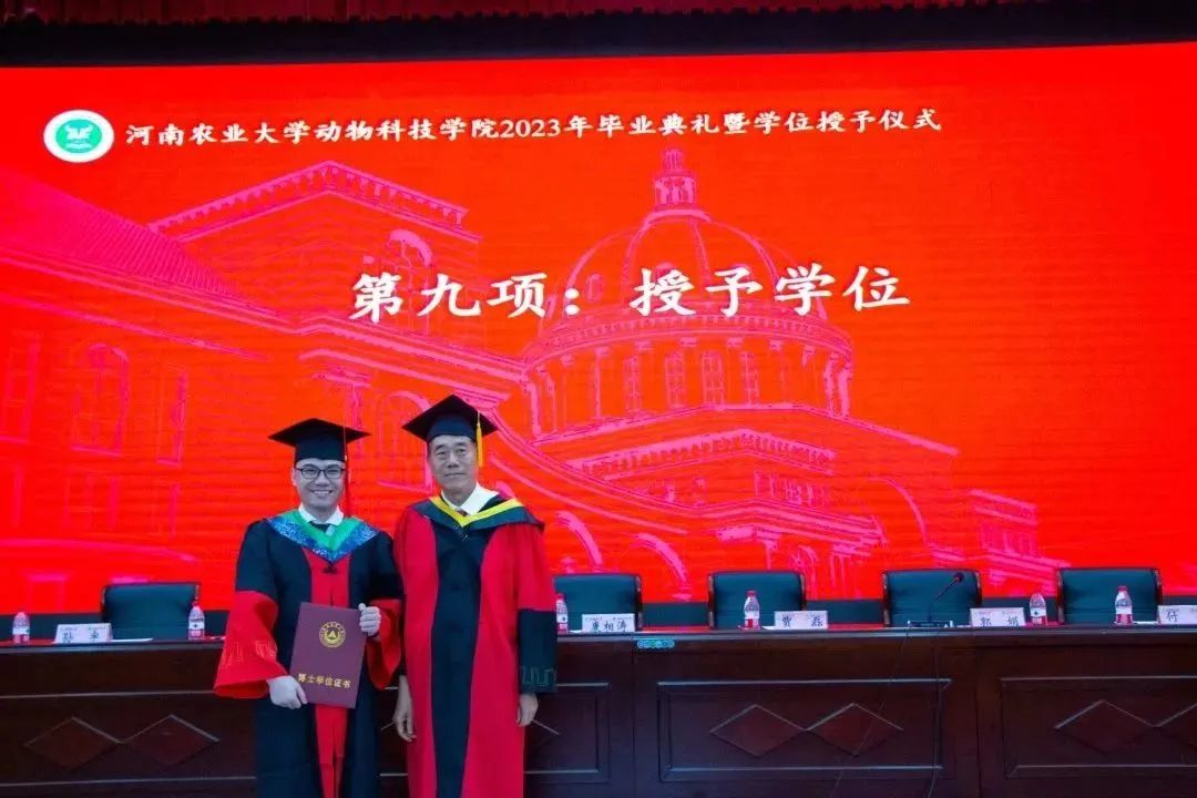 研究生毕业生代表、2020级畜牧专硕班职毅豪发言,他以三年奋斗青春回忆为始,表达了对母校的热爱与不舍,表示学院用良好学风、深厚平台、强大师资将我们雕琢成璞玉,我们要在人生的下一程,在天南海北各个地方继续发扬动科精神,到祖国需要的地方发光发热,雕刻下属于自己、属于动科人的光荣印记。