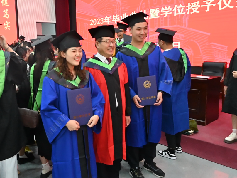 学位授予环节上,学院领导及导师代表向毕业生拨正流苏,授予毕业学位,毕业生鞠躬致谢,合影留念,现场气氛热烈。