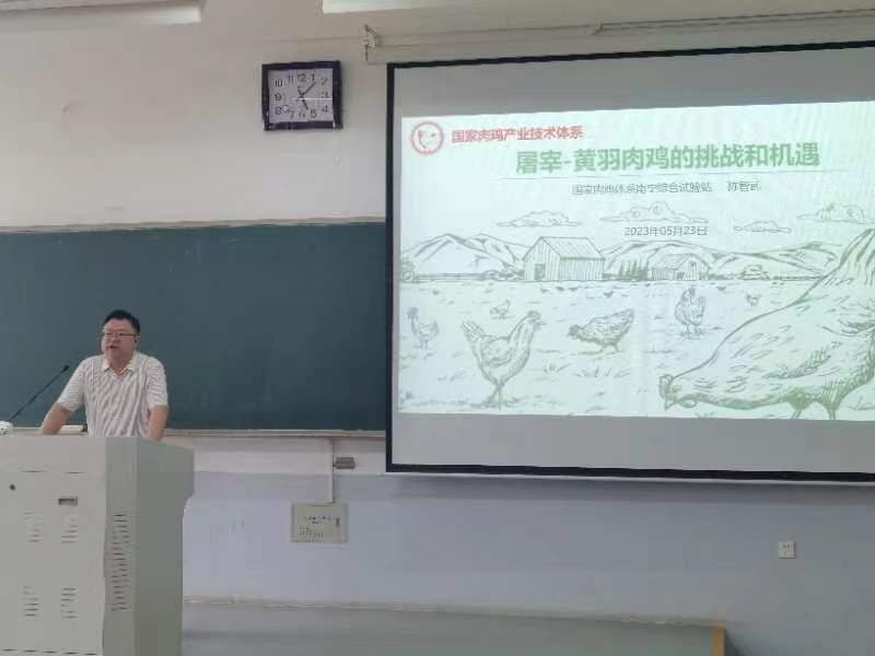 本网讯(通讯员 职毅豪)5月23日下午,在教学楼D206,广西金陵农牧集团有限公司育种总监陈智武以“屠宰-黄羽肉鸡的挑战和机遇”为主题为师生做了一场精彩的报告。刘小军教授主持会议。