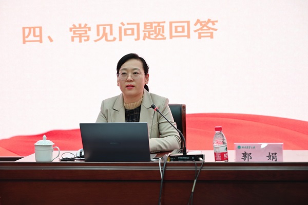 本网讯(通讯员 桑雅惠)10月25日晚,院党委副书记郭娟在龙子湖校区大教室一为2021级新生上主题为“坚定理想信念,争做动科先锋”的入党启蒙教育党课,团委书记韩笑、团委副书记黄璞和全体2021级新生聆听了党课。