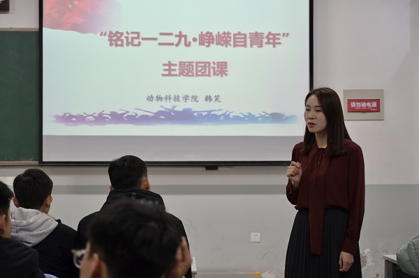 新生辅导员韩笑走进2020级动物科学专业二班和三班团支部,开展“铭记一二·九 峥嵘自青年”主题团课。