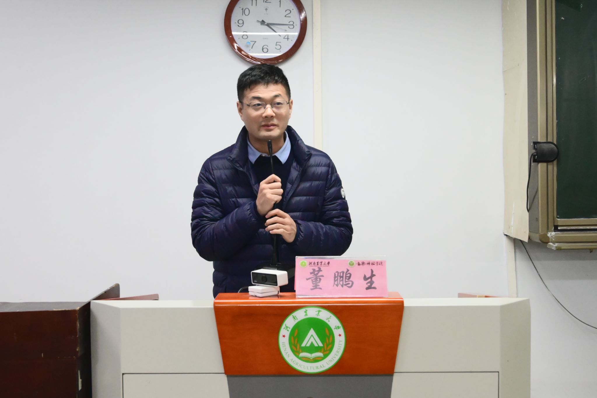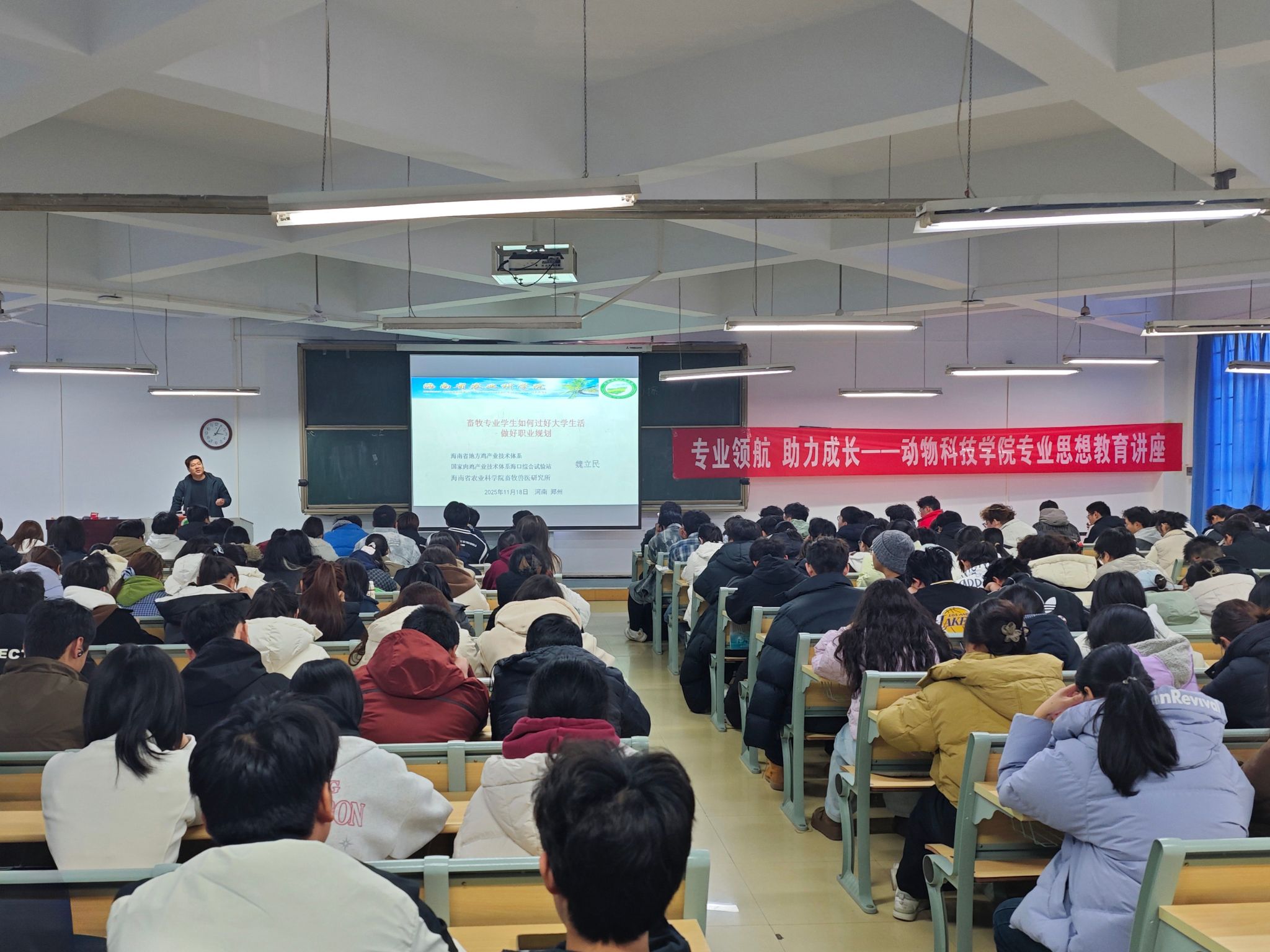 于桃李园学生公寓桃西楼204教室举办2025级动物生产类新生专业思想教育讲座。会议特邀海南省地方鸡产业技术体系首席科学家魏立民、水产与经济动物养殖系青年教师董鹏生主讲,2025级动物生产类专业全体本科生参加活动。活动由巨乳a片