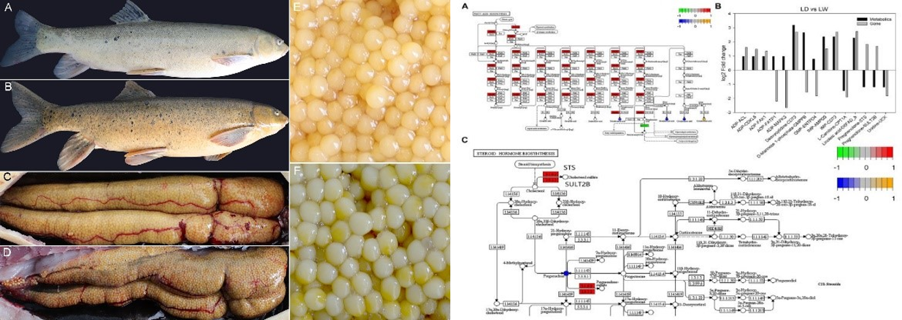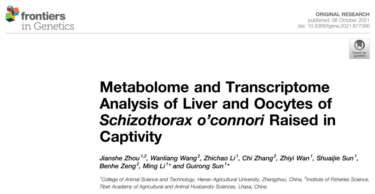 李明教授科研团队与西藏自治区农牧科学院水产科学研究所合作,探究了人工驯养条件下异齿裂腹鱼卵母细胞和肝脏在形态、代谢物和基因表达的变化,发现与卵巢发育相关的代谢物孕烯醇酮和花生四烯酸存在明显差异。代谢组学和转录组学数据的比较表明,肝脏中不饱和脂肪酸的生物合成、淀粉和蔗糖的代谢和脂肪酸的生物合成3个代谢通路差异显著。10月8日,该研究成果在期刊Frontiers in genetics(IF=4.599),以Article形式在线发表。