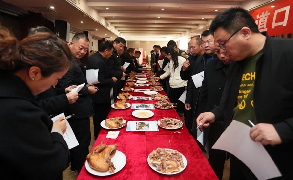 品鉴会现场香气四溢,品鉴者们细致认真地品尝了每一款产品,并在评鉴专家的指导下,对照评分细则认真打分,为道口烧鸡专用鸡配套系的选择提供了一手资料。贾磊为品鉴会题联一对,上联:道地道口赞不绝口,下联:好看好吃各取所好,横批:校地交好。