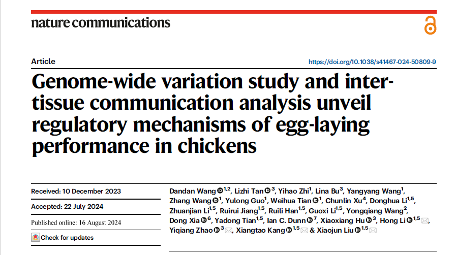 康相涛院士团队在地方鸡产蛋性状调控机制研究方面取得突破性进展。于2024年8月16日在国际著名期刊《Nature Communications》 (IF=14.7)在线发表了题为“Genome-wide variation study and inter-tissue communication analysis unveil regulatory mechanisms of egg-laying performance in chickens”的研究论文。首次系统揭示了外周组织关键内分泌因子通过组织间通讯的方式调控鸡产蛋量性状的新机制,为鸡产蛋量性状的调控机制解析提供了新见解。