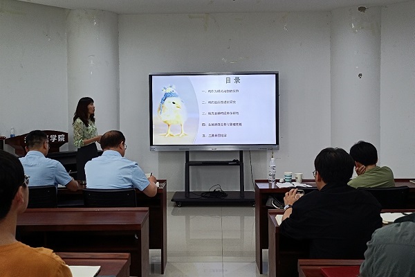 李地艳教授以鸡作为模式动物的优势、鸡的适应性进化研究、地方品种鸡遗传多样性、生殖道微生物与繁殖性能、三维基因组学等五个方面分享。李地艳教授以全基因组重测序分析藏鸡及四川地方鸡品种的种群差异及进化特征、染色质空间结构变化介导的卵泡发育过程中颗粒细胞的转录调控、单细胞转录组解析鸟类卵巢萎缩机制、启动子-增强子互作介导的转录调控与骨骼肌功能特性有关为例子,讲解了自己的研究内容。李地艳教授分享的内容丰富饱满,对当下多组织互作研究的热点给予了自己的一些见解,也为学院研究生的科研提供了新的思路。