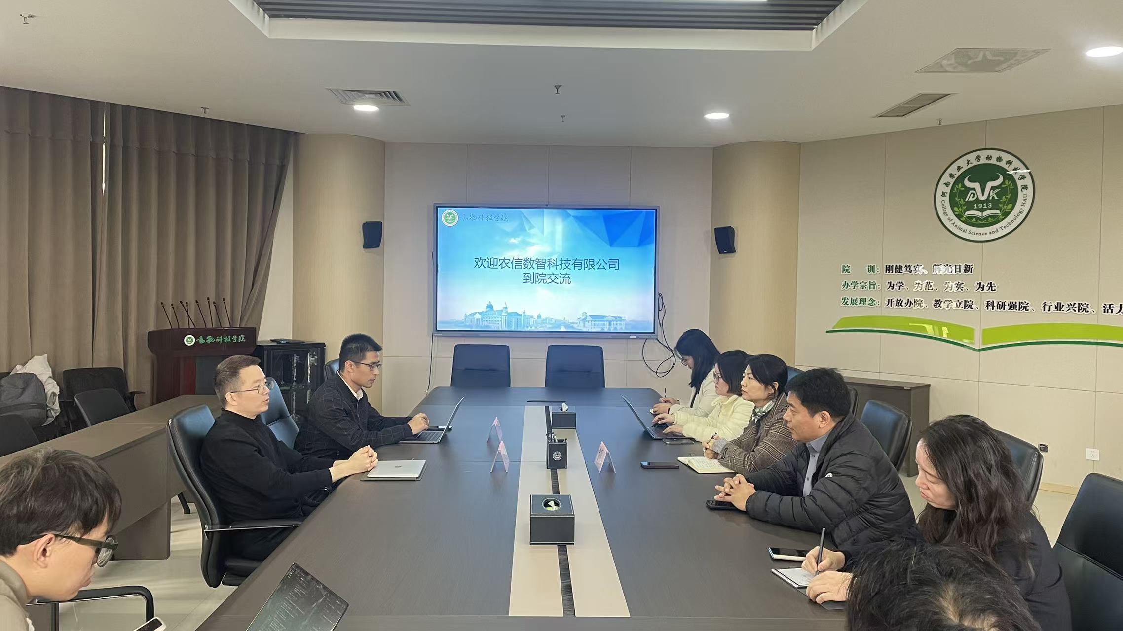 上午,纪良勇先生与牧原产业研究院副院长、智慧牧业科学与工程专业带头人蒋瑞瑞教授,智慧牧业科学与工程专业相关教师及猪育种团队成员在501会议室进行了座谈。座谈会上,纪良勇详细介绍了农信数智公司的业务布局、发展理念及在农业数智化领域的最新成果。双方围绕牧场智能化建设、数字化教育创新等议题进行了深入交流和探讨,共同展望了智慧畜牧业的广阔前景,并就未来可能的合作方向交换了意见,为学院在智慧畜牧领域的教学科研发展注入了新的思路。