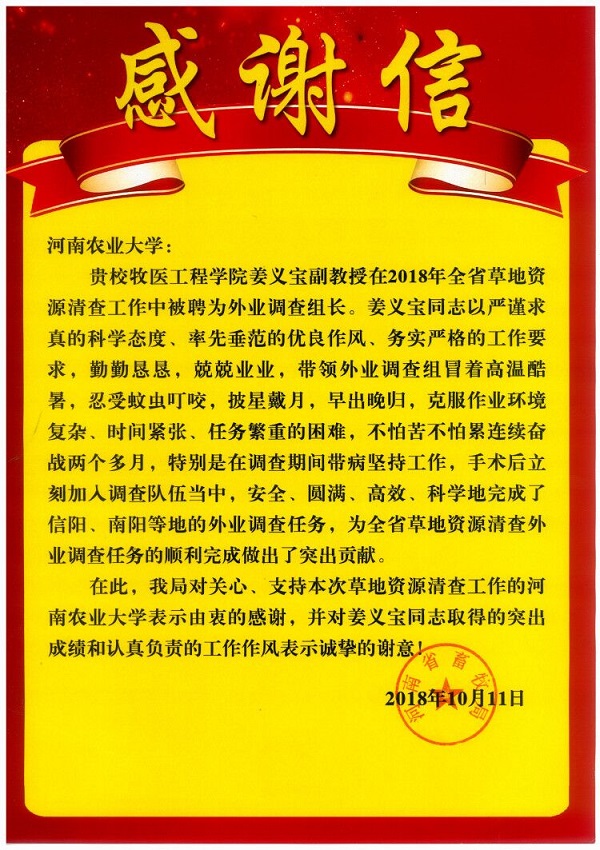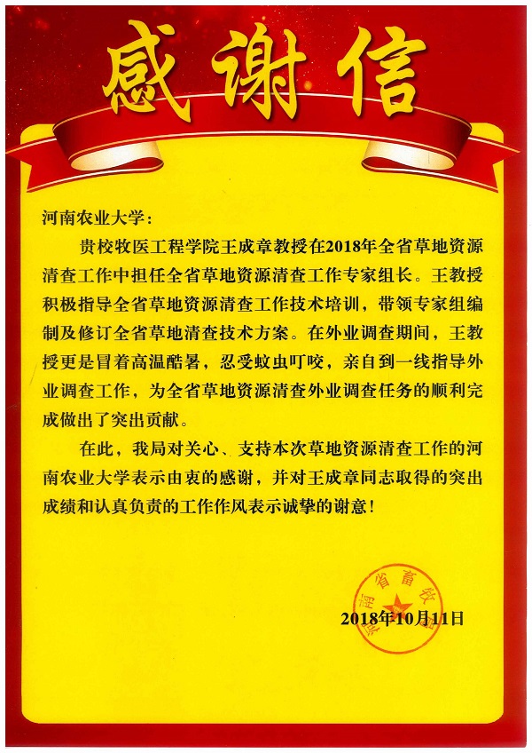 日前,巨乳a片 收到来自河南省畜牧局的感谢信,对巨乳a片 教师王成章、姜义宝在2018年全省草地资源清查工作中所做的出的贡献表示感谢,对他们严谨求真的科学态度、率先垂范的优良作风、务实严格的工作要求、吃苦耐劳的工作精神给予高度评价。他们的表现也展示了我们牧医人的风采。(文/韩笑)