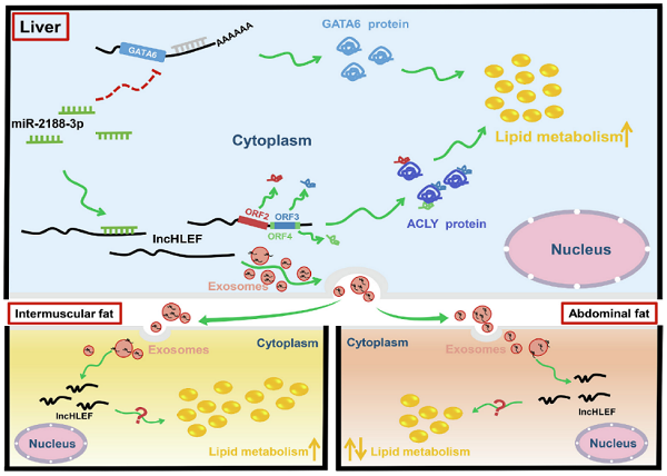 肝脏是鸡脂质代谢的主要器官,但有关鸡肝脏脂质代谢的调控机制,特别是长链非编码RNA(lncRNA)在这一过程中的作用机制依然不清。为此,课题组通过对产蛋前期和高峰期母鸡肝脏全长转录组分析,系统研究了鸡肝脏lncRNA与脂质代谢的关系,并鉴定出一个可促进肝细胞脂滴形成、甘油三酯和总胆固醇合成的基因间lncRNA lncHLEF。体外试验分析表明,lncHLEF不仅可以作为竞争性的内源性RNA调节miR-2188-3p/GATA6轴,还可编码3个功能小肽直接增强ACLY蛋白的稳定性,进而促进脂质合成。腺相关病毒介导的肝特异性lncHLEF过表达活体试验表明,lncHLEF可促进肝脏脂质合成,同时通过外泌体形式转运lncHLEF,从而促进肌内脂肪(IMF)沉积,但不改变腹部脂肪(AbF)沉积(图1)。该成果 “LncHLEF promotes hepatic lipid synthesis through the miR-2188-3p/GATA6 axis and encoding peptides, and enhances intramuscular fat deposition via exosomes” 以研究论文形式在线发表于国际著名期刊《International Journal of Biological Macromolecules》(中科院一区)。巨乳a片 在读博士研究生郭玉龙为论文第一作者,已毕业的王丹丹博士及田卫华硕士、杨丽玉硕士为论文共同第一作者,李红副教授和刘小军教授为论文通讯作者。实验室毕业的王章博士,在读博士研究生吴星和职毅豪,硕士研究生张珂和王阳阳,团队李转见教授、蒋瑞瑞教授、孙桂荣教授、李国喜教授、田亚东教授和康相涛教授以及美国南卡罗来纳医科大学Hongjun Wang教授参与了该项工作。该研究受到国家重点研发计划项目、国家自然科学基金及河南省重大科技专项联合资助。论文链接://www.sciencedirect.com/science/article/pii/S0141813023039582?ref=pdf_download&fr=RR-2&rr=812286342fbe67bd。