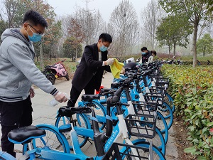 共享单车给学生带来了便利的同时也带来了烦恼,乱停乱放的现象总是屡见不鲜,特别是横七竖八地随意停放,看得让人“刺眼”。下午3点,党员志愿者们对学校实验楼和图书馆等周边的共享单车,开始进行集中摆放,回归原位。共享单车都是锁住的,男同志一鼓作气抬到指定位置,女同志通过合作,统统将现场的共享单车摆放整齐。针对单车上的灰尘、垃圾、小广告等现象进行深度清洗。存在损坏问题的单车,统一安放并向哈啰单车运维反映维修,清洗结束后,所有共享单车实行无差别消毒,将车把手、车座、车篮、车锁等骑行者易接触的部位,进行喷洒消毒,确保干净无污物并进行标注。让大家能够放心骑行,最大程度保障出行的安全。